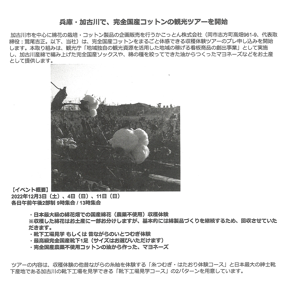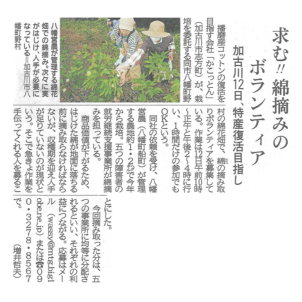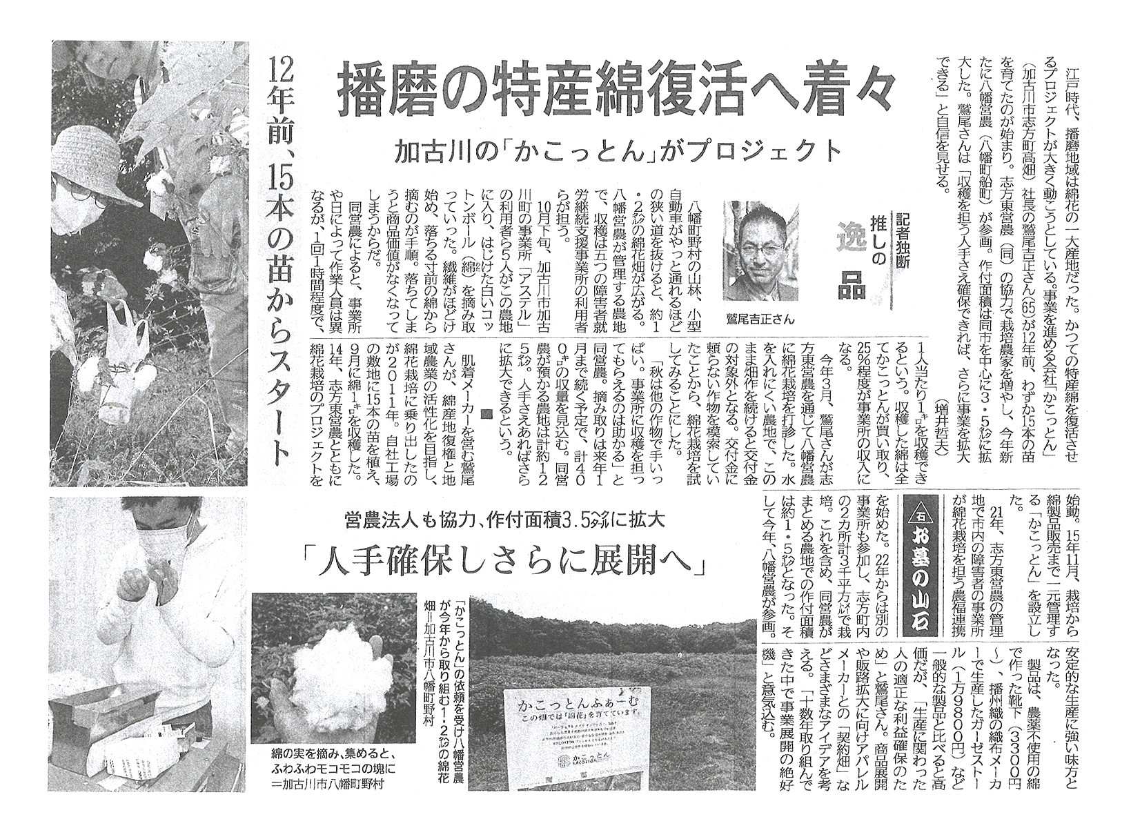 加古川を中心に2011年より綿花栽培に取り組んでいます、エシカルでサステナブルな仕組み作りで地方創生を実践し新たな産業を興したいと考えております。